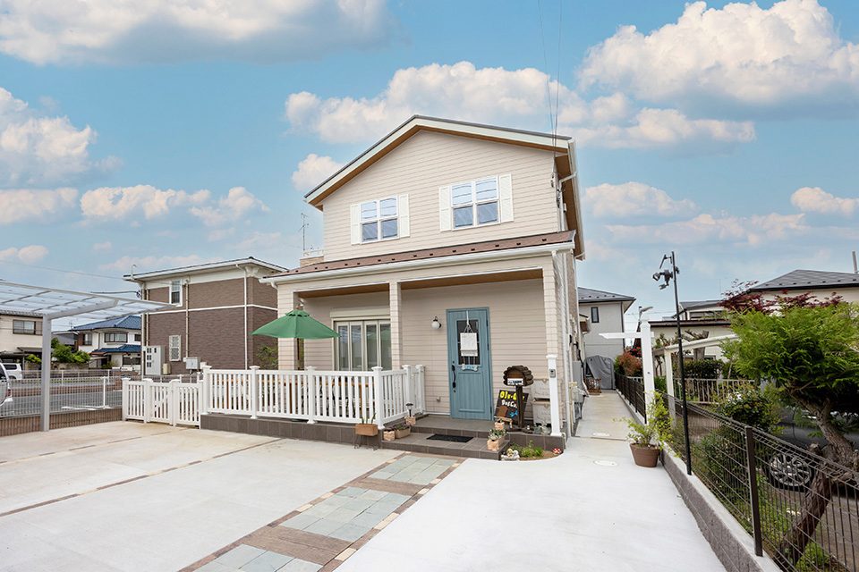 店舗側にはブルーの玄関ドアを、サイディングはベージュのものを採用して、爽やかな印象にしました。