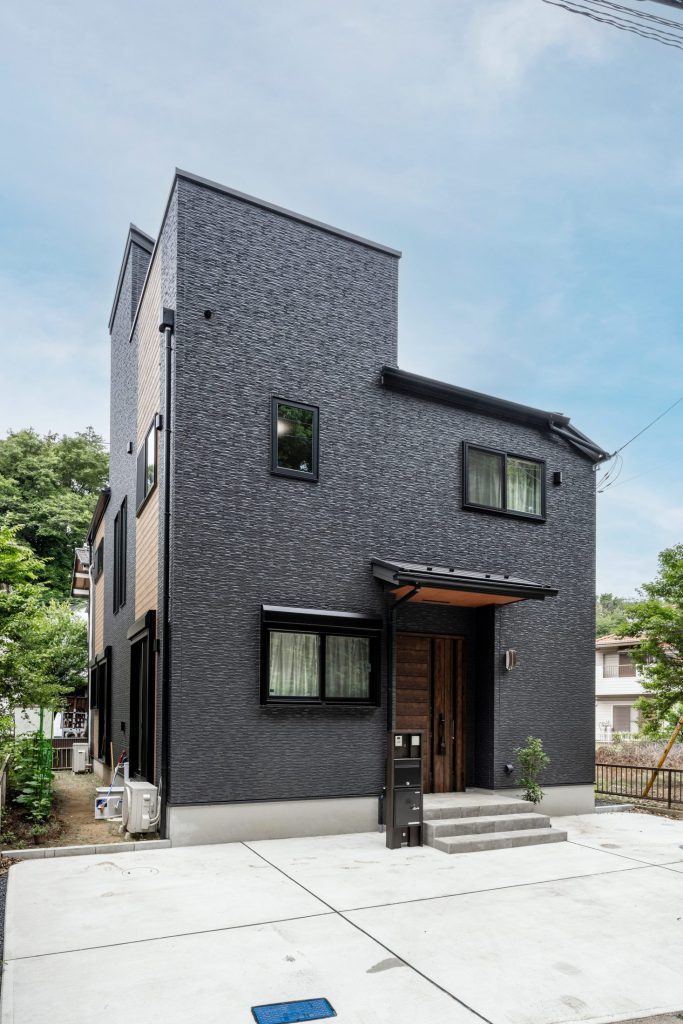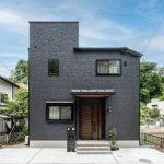 メインカラーを「ブラック」、玄関ドアと玄関ポーチの軒天にアクセントの「ダークブラウン」を取り入れた外観に。