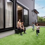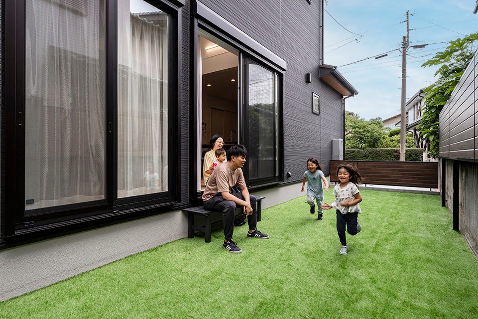 庭には人工芝を敷き、子どもたちが自由に走り回れるようになっています。