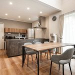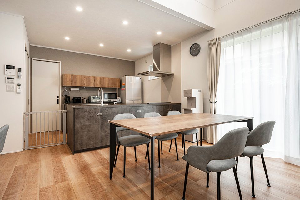 ダイニングのテーブルやチェアーも、キッチンのデザインに合わせて統一感をもたせています。