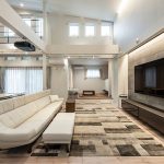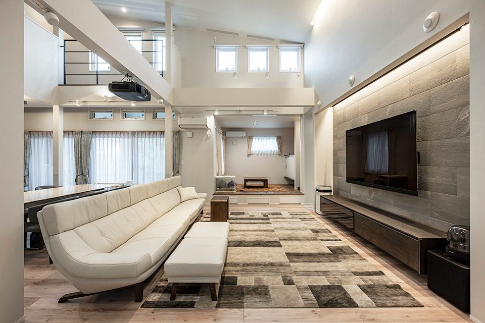 リビングは壁掛けテレビにして、間接照明やエコカラットが目を惹く空間になりました。実は上部にスクリーンもつけていて、プロジェクターを投影して、映画やゲームも楽しめるようになっています。