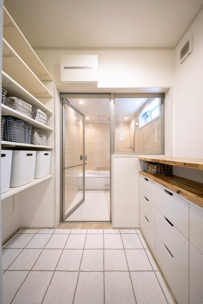 お風呂場のガラス張りは、夫も最初は「これいるの、、?」という反応でしたが、中の様子が見えるので、お風呂上がりの子どもを受け取る準備ができます。結果的に取り入れてよかったと感じています。