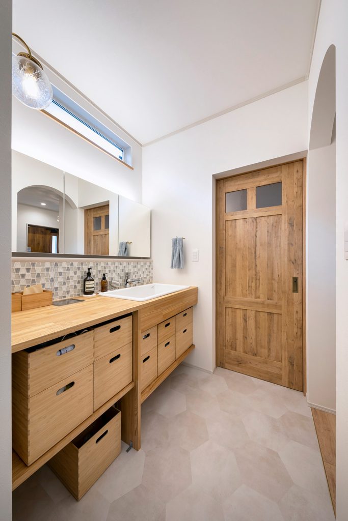 1階、2階とも、こだわりの造作洗面で、お気に入りの場所です。タオルハンガーにしても、ライトにしても、細かい部分までこだわりました。
