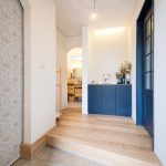 框は斜めにして、少しでも空間を広く感じられるようにしています。大好きなブルーの建具と、収納部分のロールカーテンの北欧デザインがお気に入りです。