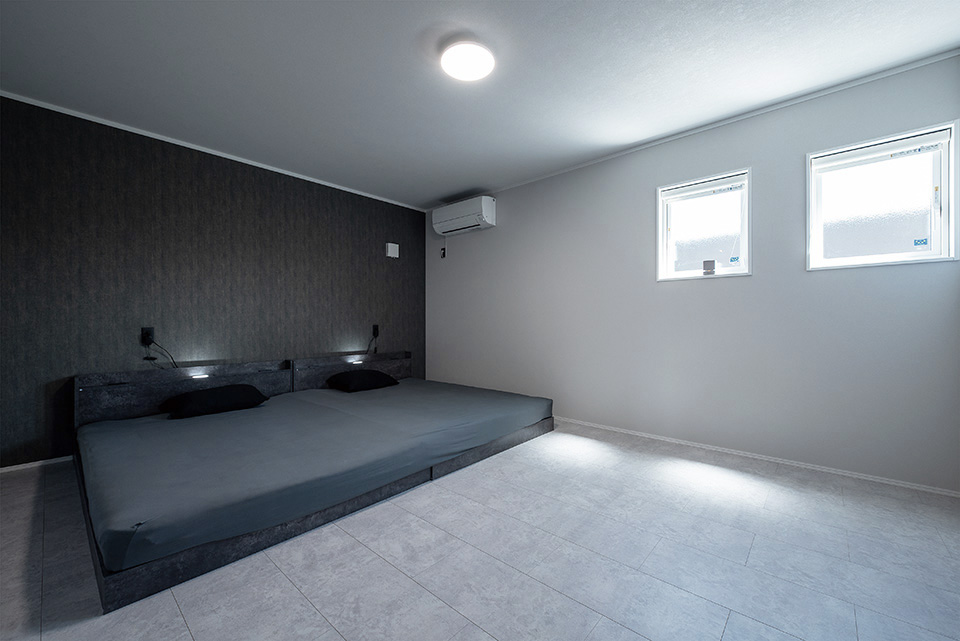 LDKや他の部屋と、少しテイストを変えています。モダンなアースカラーのクロスを壁一面に採用しました。