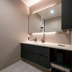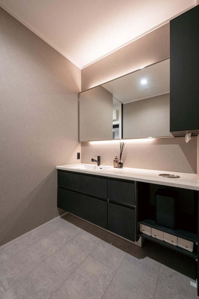 洗面化粧台は、夫婦ふたりが並んで使える広々とした設計にしました。幅1,480mmの大型鏡には間接照明を取り付けて、ホテルライクな仕上がりになったと思います。