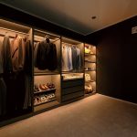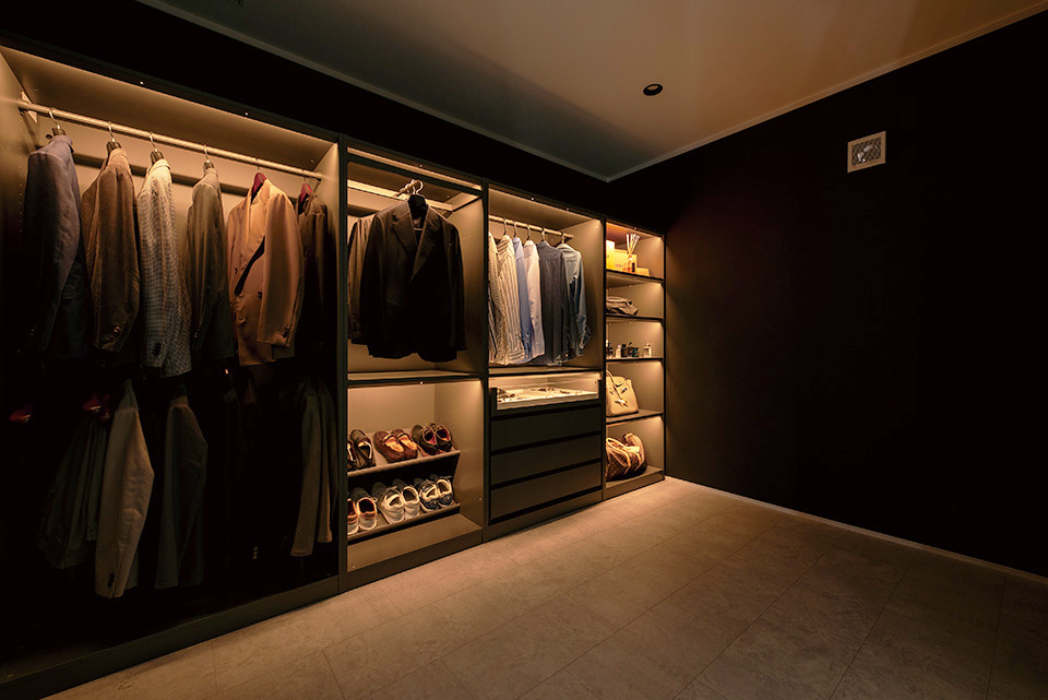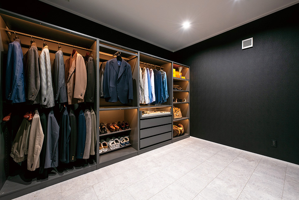 スーツなどをインテリアのように飾って収納できる、海外スタイルのクローゼットです。以前の住まいでは、リビングに私(ご主人)の服が散らかってしまっていたため、収納場所をしっかりつくれるように専用の部屋を設けました。