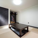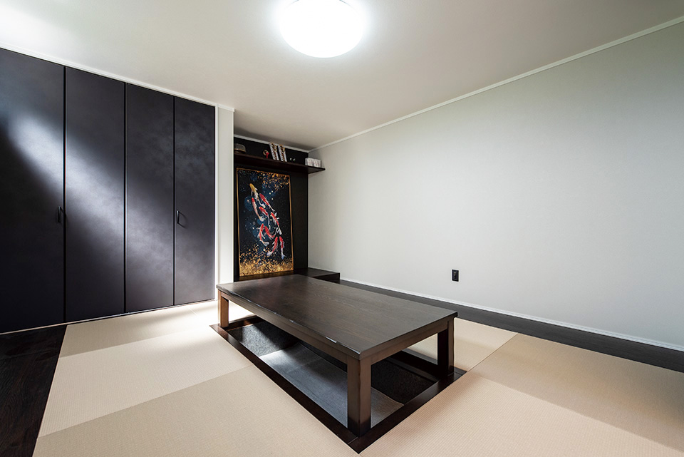 リビングの一角には、子どものお昼寝や遊び場として活躍する和室を設けました。モダンな琉球畳と掘りごたつで、リビングの雰囲気にも馴染む落ち着いた空間です。これから家族も増えるので、重宝すると思います。
