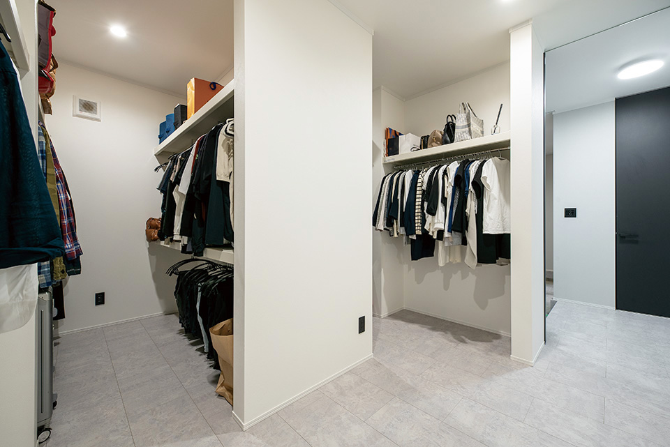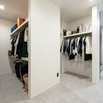 おかげで朝の準備も1階で完結でき、時間にゆとりが生まれました。広々とした収納は、家族全員の衣類をすっきりと片付けることができます。