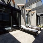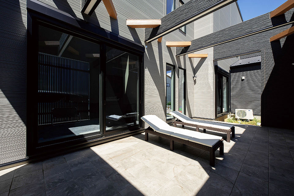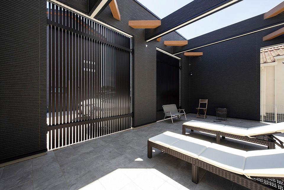 リビングからも行き来できる、タイル仕上げのピロティです。休みの日にサウナを設置してゆったり過ごしたり、子どものプールの遊び場として使用したりしています。格子を設けているので、周りからの視線も気にならず安心です。