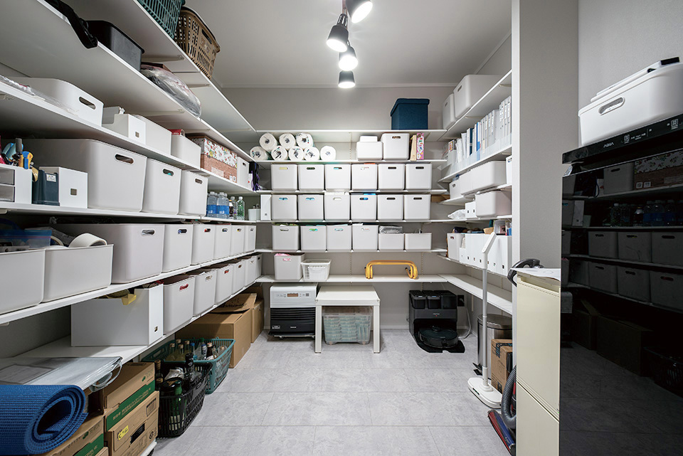 買いだめしたものをたくさん収納できるように設けました。可動棚式&コの字型にしています。お米や冷凍庫など、大きいものもすべてこちらに仕舞っています。