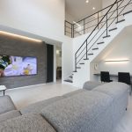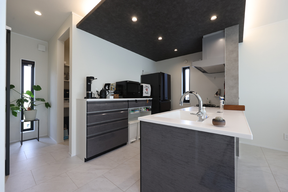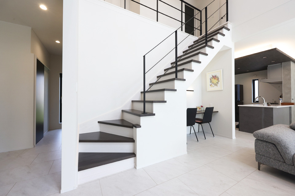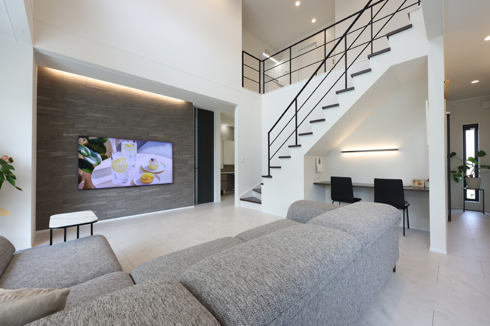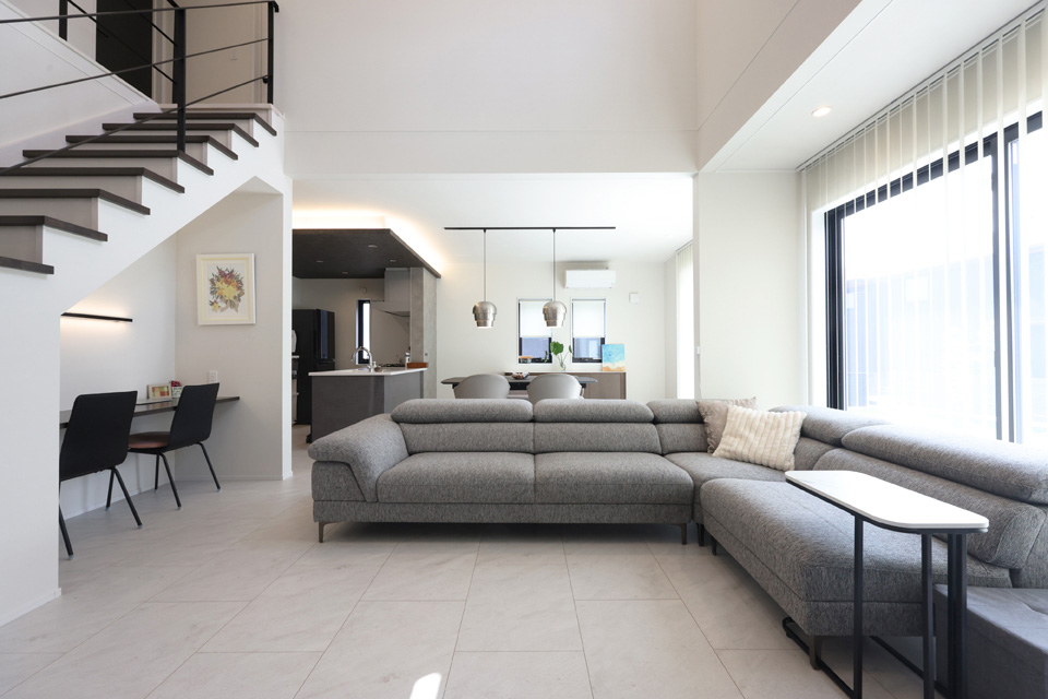 非日常を日常に。広々とした30帖のLDK×吹き抜けにより開放感を叶えた、モノトーンデザインのお住まいです。