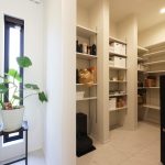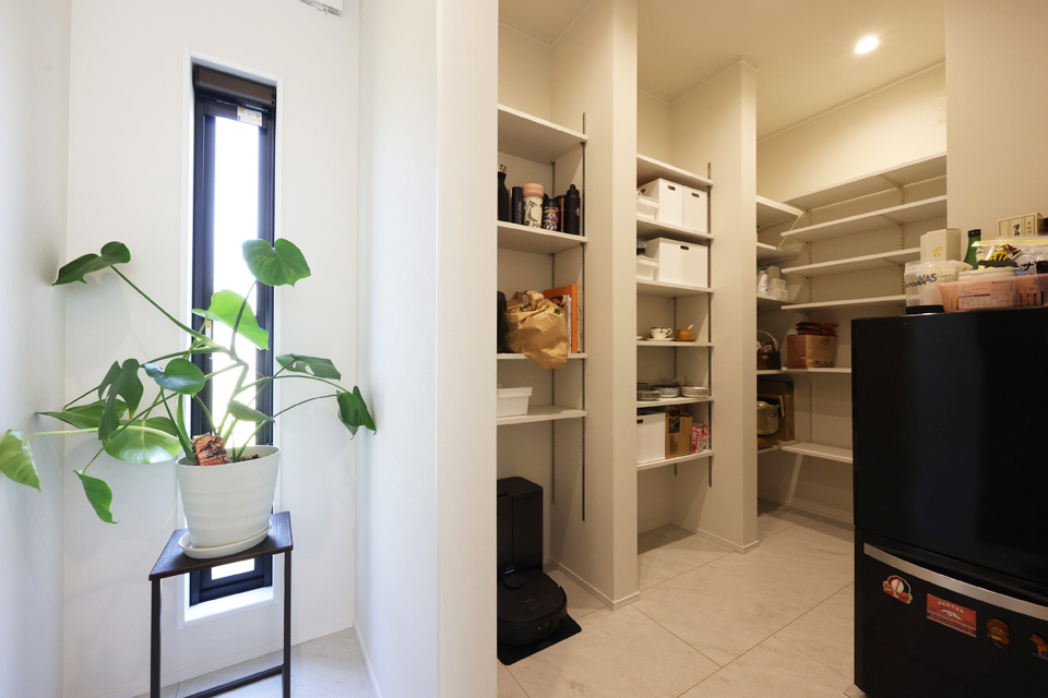 パントリーは3帖と広いので、第二の冷蔵庫を置いたり、大事な書類を置いたりしようと考えています。収納量が抜群なので、LDKの収納も兼ねています◎
