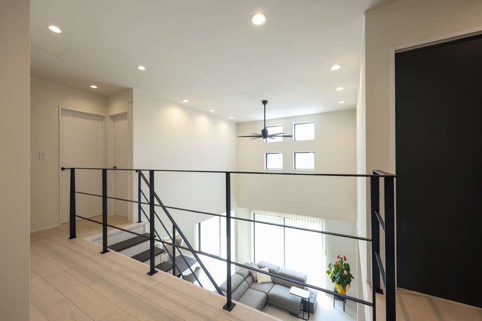 最初は階段部分まで吹き抜けにする予定はなかったのですが、設計さんに「階段まで吹き抜けにして、手すりをおしゃれにしたほうがよいのでは?絶対にやったほうがいいですよ!」と提案をもらいました。