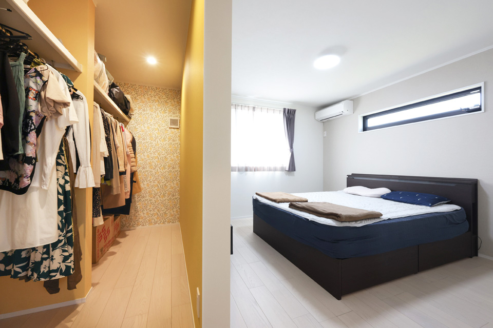 WICは元気が出るような色使いにしたくて、黄色に。ほかの部屋がシンプルなので、遊び心のあるクロスにしました。