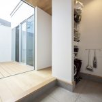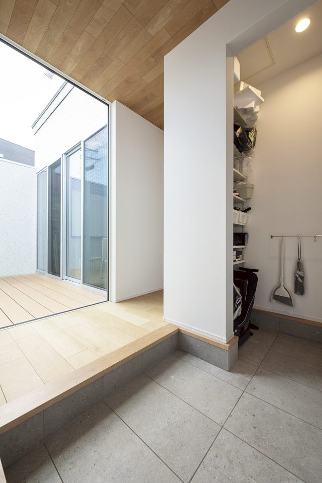 前面道路から丸見えにならないよう、少し奥まった部分に玄関を設けています。玄関に入るとすぐ正面が中庭になっていて、開放感を感じることができます。