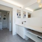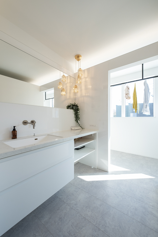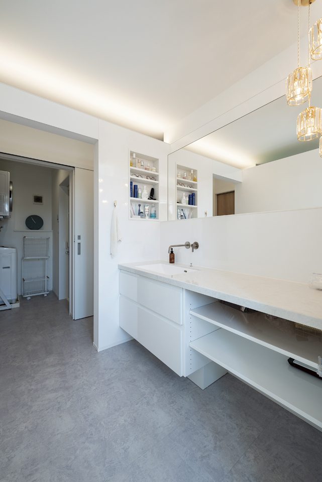 2階は全体で「ホテルライク」をテーマにしていて、洗面化粧台は存在感のある一枚鏡を採用。お気に入りのシャンデリアは、天板とタイル全体に光が飛ぶように配置にこだわりました。