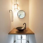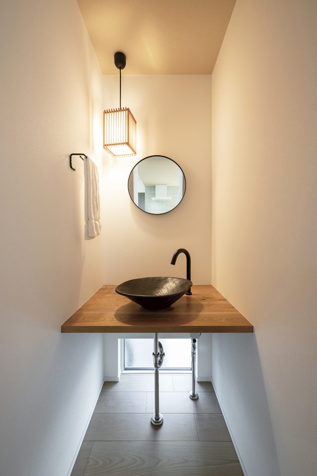 洗面は渋めのテイストにしたかったので、陶器のボウルと四角いペンダントライトを採用しています。