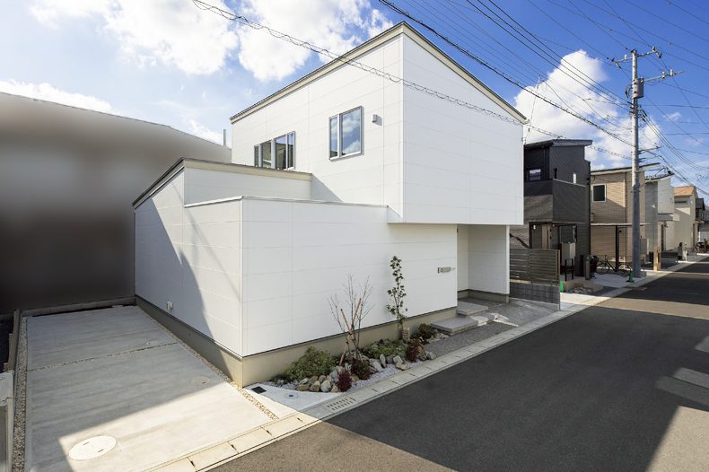 北側が道路に面しているので、窓をなくしたシンプルなスタイルの外観にしました。
