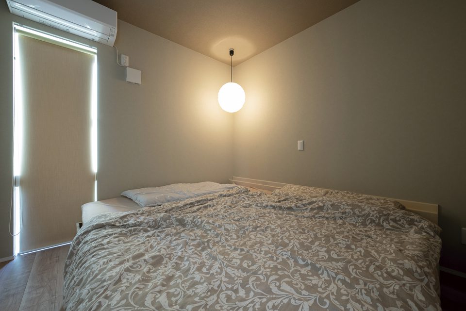 寝室は和の雰囲気を取り入れて、落ち着いたトーンのクロスと照明でまとめました。太陽の光がしっかり差し込むよう、窓も設けています。