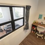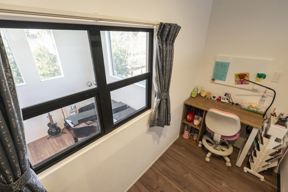 間取りの関係上、片方にしか窓を付けられなかったため、もう片方はスキップフロアが見える室内窓を設置しています。