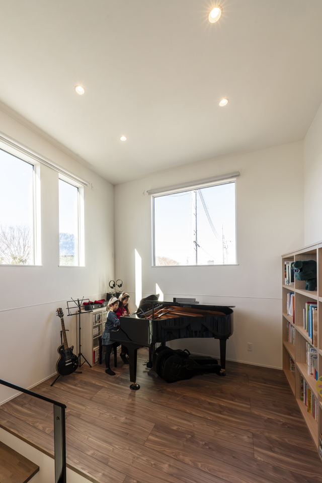 スキップフロアには妻の実家から持ってきたピアノを置いています。そして、一面は本棚に。お気に入りの本や漫画を収納しています。