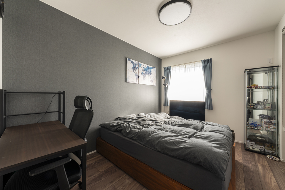 落ち着いた空間にしたいと思い、壁一面にアクセントクロスを採用しました。