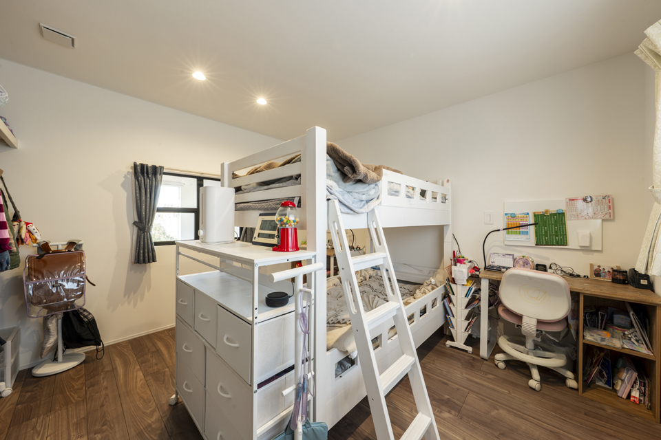姉妹なのであえて部屋を分けておらず、真ん中に2段ベッドを置いて仕切り代わりとしています。収納はそれぞれ作りました。