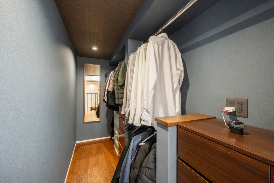 2Fにファミリークローゼットもあるのですが、それとは別で私(ご主人)専用のスペースを設けました。お気に入りのネイビーカラーを取り入れています。