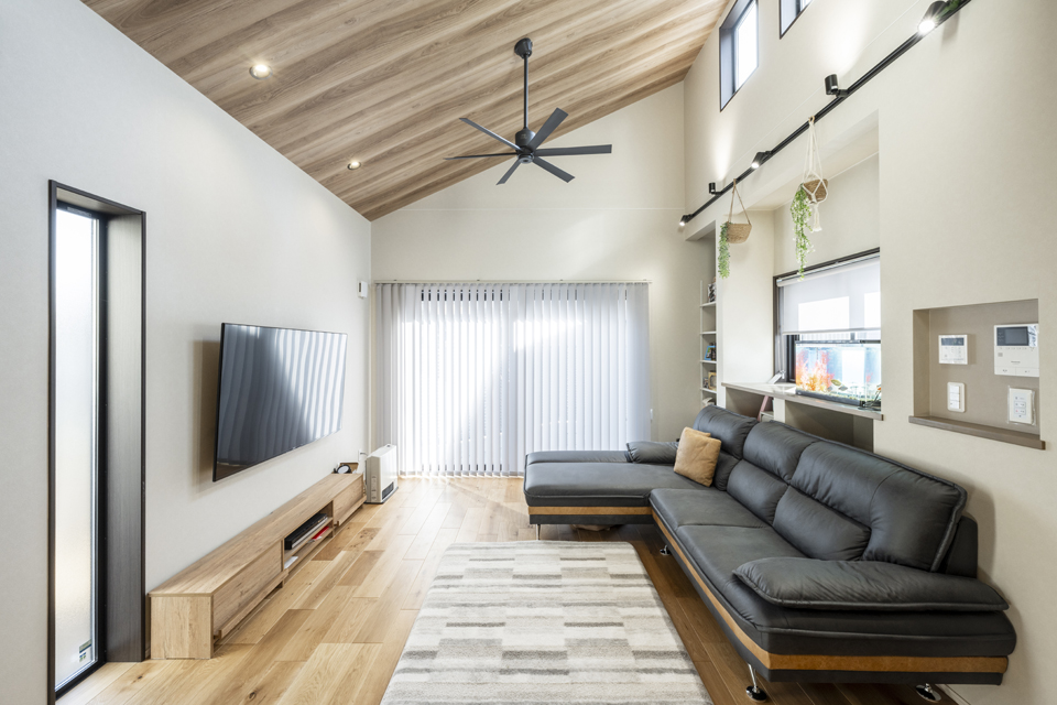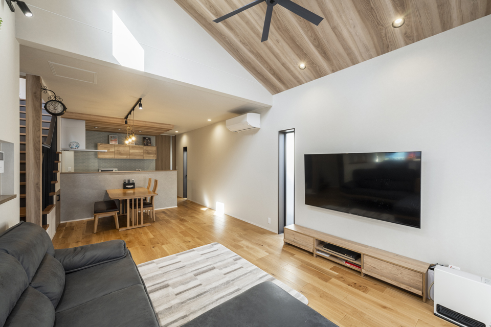 リビングは、光をたっぷり取り込める吹き抜け&勾配天井に。明るくて開放感のある空間がお気に入りです。
