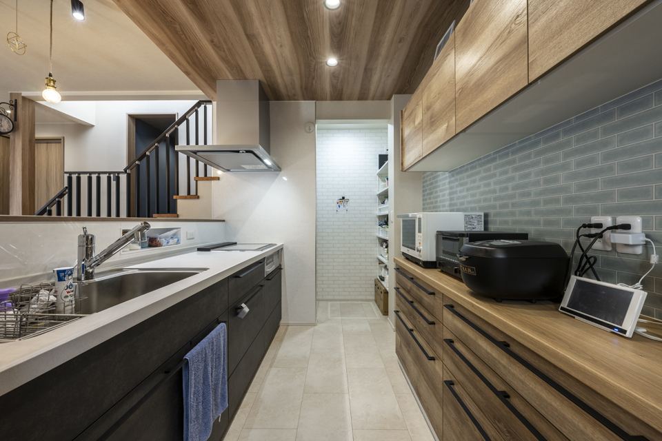 奥には2帖のパントリーがあり、冷蔵庫を隠すように収納しています。お客さんにも見えないのが嬉しいですね。