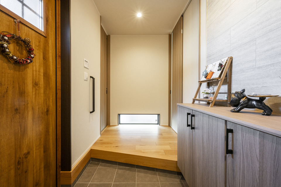 玄関収納は、インテリアも楽しめるようカウンタータイプに。玄関を入って正面の壁には、アクセントクロスも取り入れました。