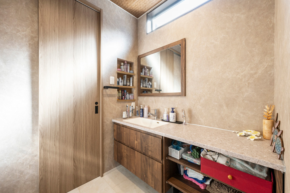カウンターは横幅が1680mmあるので、2人ならんで使っても余裕があります。壁面にはニッチを設けて、化粧品を収納しています。