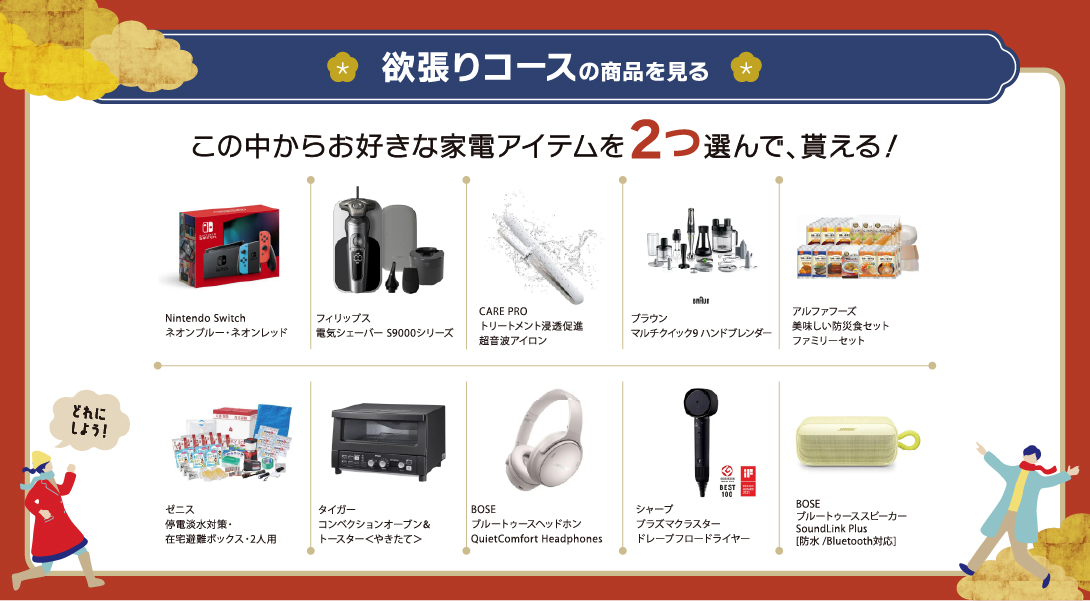「贅沢コース」または「欲張りコース」のどちらかのコースから、お好きな商品をプレゼントいたします