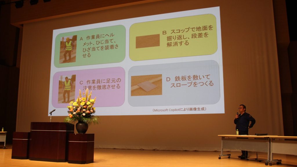 安全衛生大会の中では、ゲストとして千葉労働局の方と柏警察署交通課の方をお招きして、危機管理アセスメントについてや自動車事故を起こさないような注意など、安全に日々の業務をこなしていくための意識についてご講演いただきました。