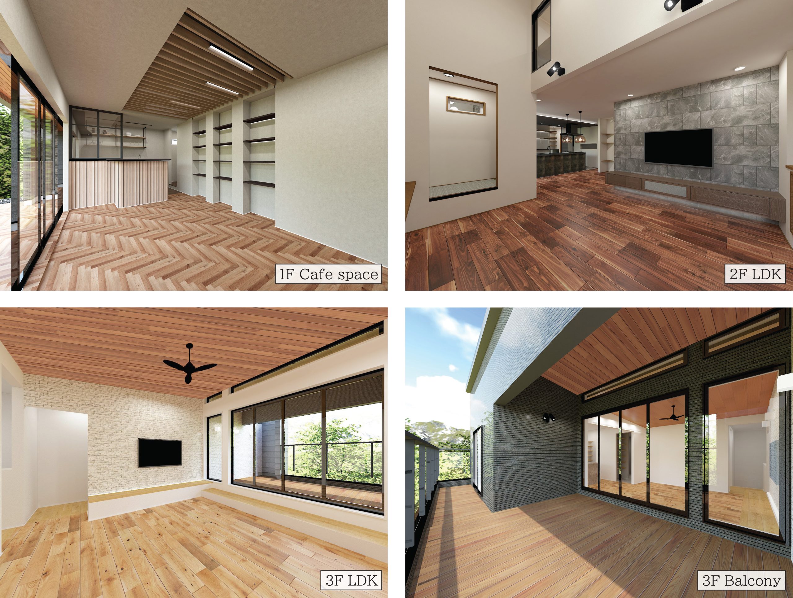 店舗併用住宅を想定し、約15帖の北欧風カフェ(店舗)を併設した間取りになっています。テラスと一体となったヘリンボーンの床材が、居心地のよい柔らかい空間を演出しています。
